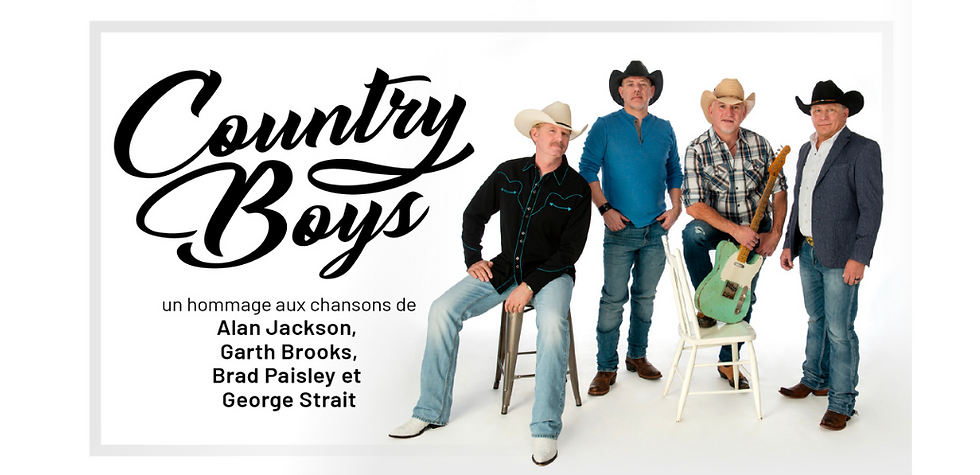 COUNTRY BOYS est un spectacle hommage à la musique de Alan Jackson, Garth Brooks, Brad Paisley et George Strait. Imaginez ces quatre grands artistes légendaires de la musique Country ensemble sur une scène …le show COUNTRY BOYS vous transporte là! Ce spectacle hommage est présenté par: Scott & Gerald Delhunty, Marc Babin et Daniel Goguen. Vous entendrez la majorité de leurs grands succès comme: Chattahoochee, Friends in Low Places, The Fireman et Mud on The Tires, accompagné de 5 musiciens talentueux. Des musiciens du groupe Country Boys ont déjà partagé la scène avec des grandes légendes, comme: George Jones, Alan Jackson, Brooks & Dunn, Alabama, Gene Watson, Toby Keith, Sammy Kershaw et Lorrie Morgan. Pour les amateurs de la musique Country des années 90, ce spectacle est pour vous!
